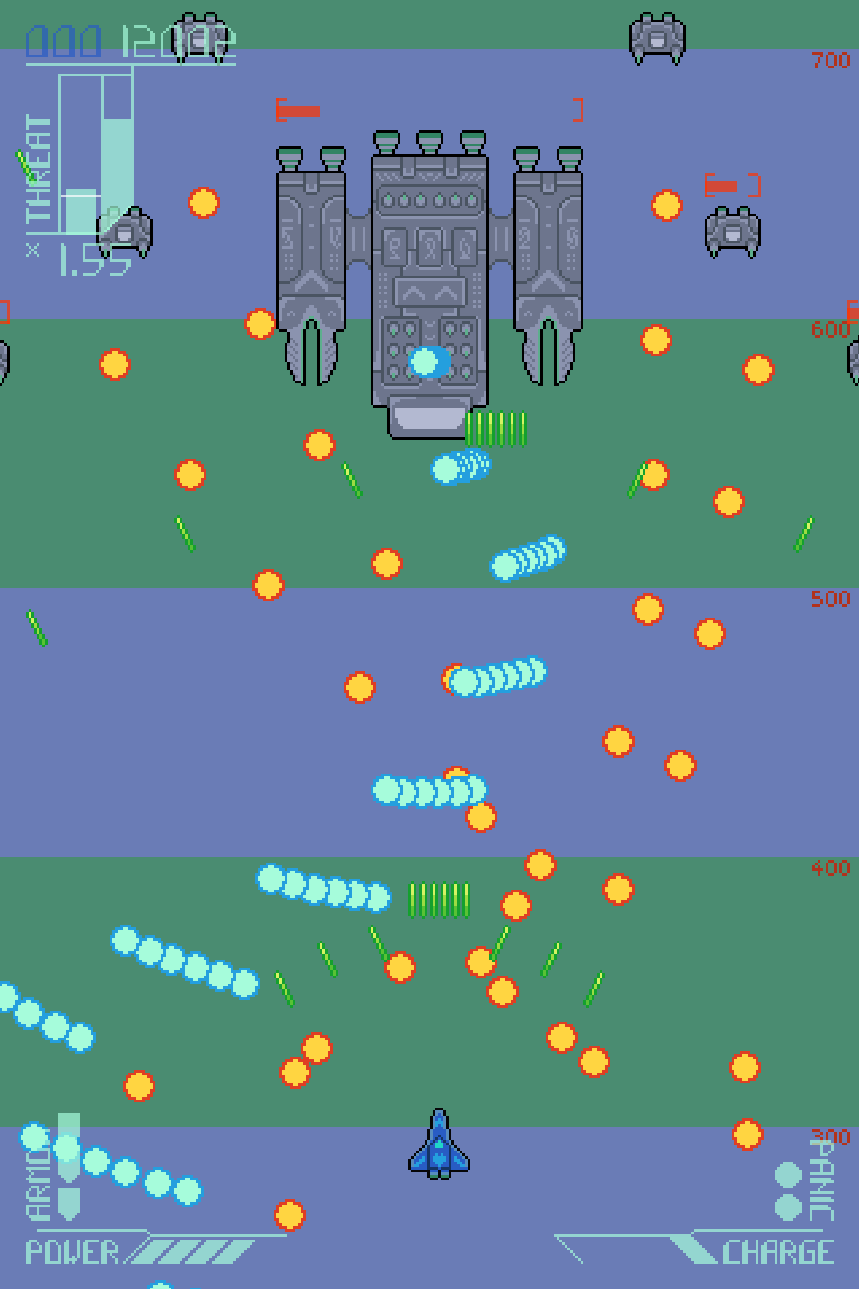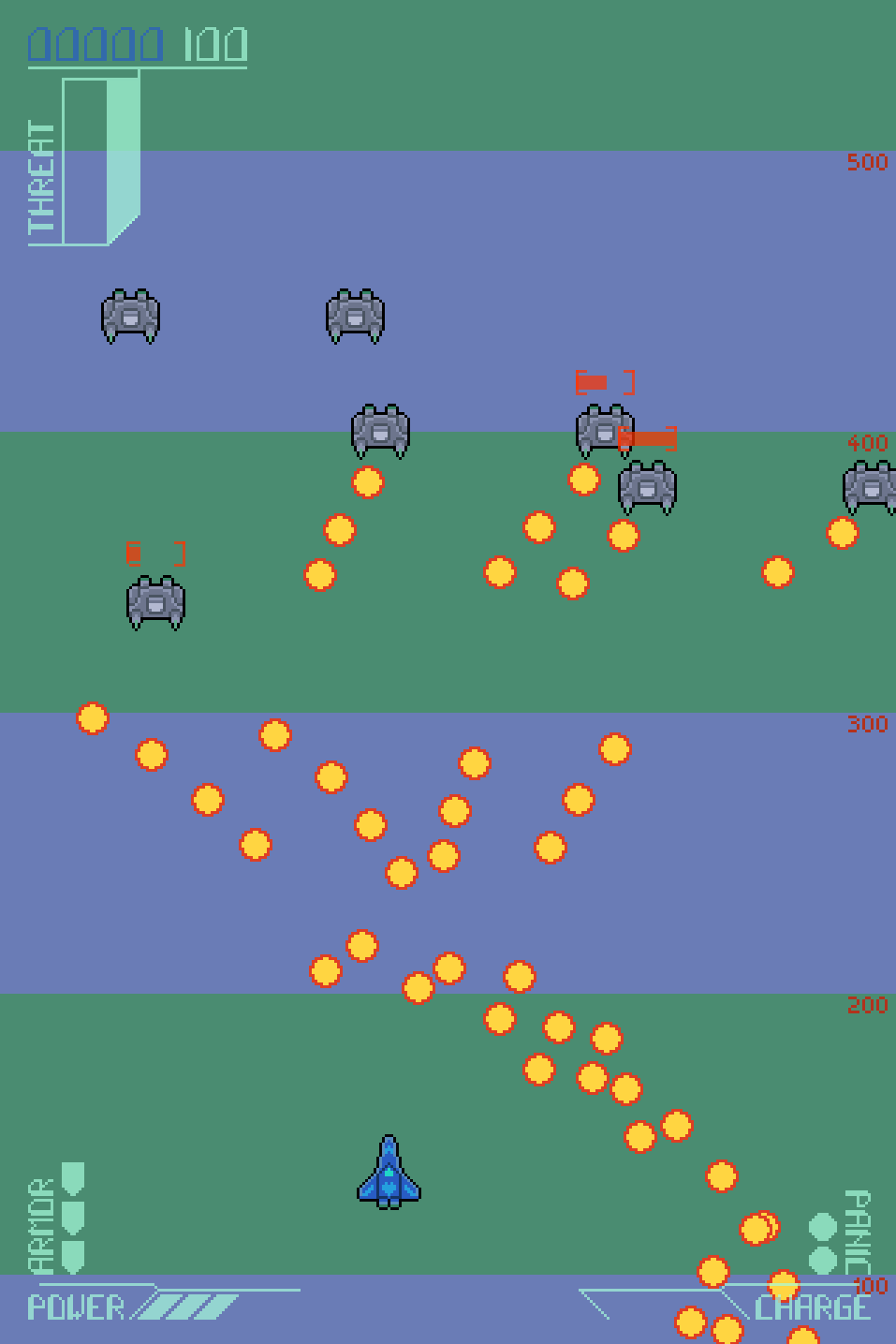 Panic is an emergency system that lets out a stream of shots in a large area around your ship. They don't do much damage, but they can clear away enemy bullets, making them invaluable for survival. Panic is a limited resource, and once there are none remaining, the system can no longer be triggered.